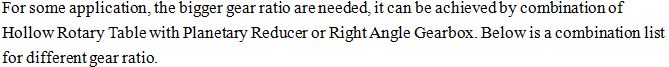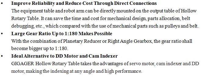 Това е моделът Hollow Rotary Table с номер GSN200-18K-SV с размер на предавателно число 200 mm 1:18 за серво мотор. Кухата ротационна маса GIGAGER, наричана още Hollow Rotary Stage, е предназначена специално за серво моторна скоростна кутия за приложения за управление на движението. Той изцяло се възползва от гъвкавостта на серводвигателя, като дава на дизайнерите по-голяма свобода при проектирането на механизмите.